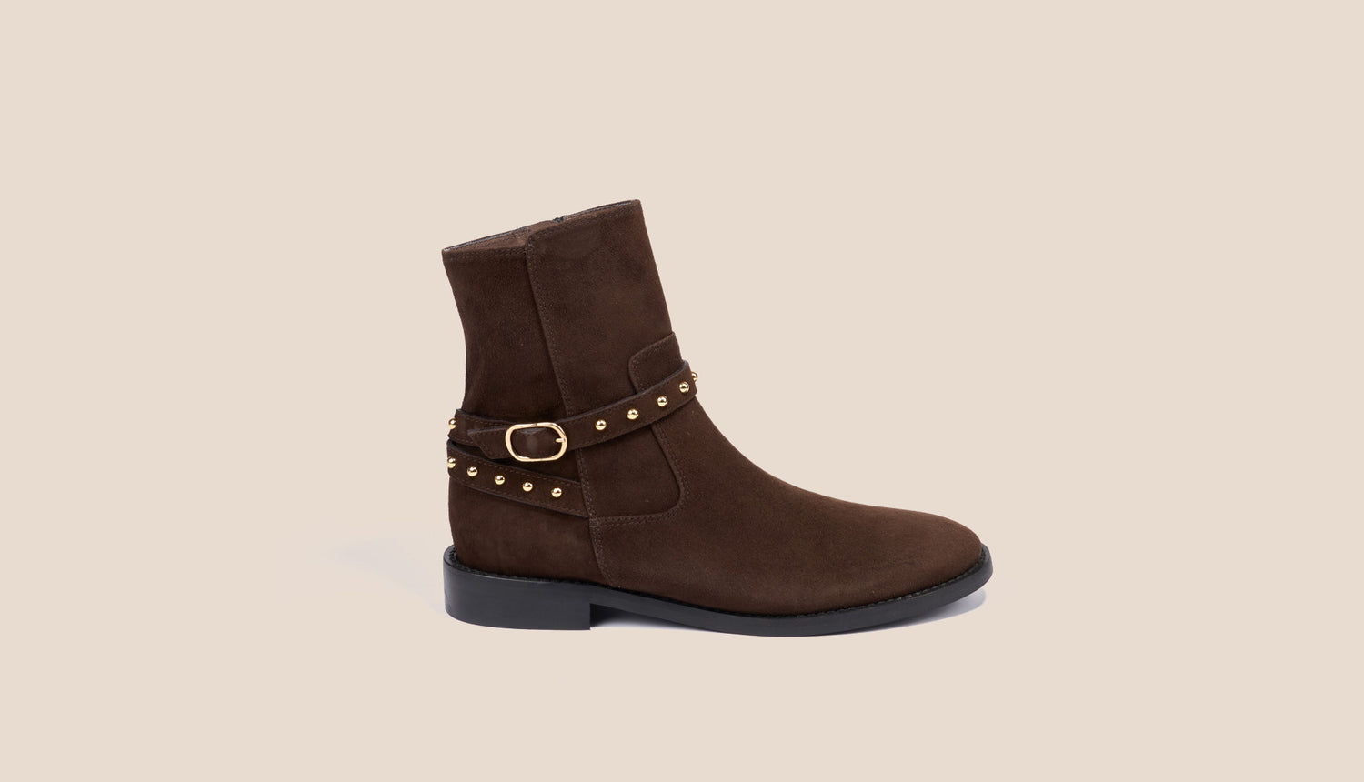 Supple, premium Italian leather shapes the foot with effortless elegance, while a sculptural strap—adorned with shimmering gold-tone studs—wraps the ankle in pure confidence. It’s the kind of boot that transforms even the simplest outfit into something unforgettable. Sleek. Bold. Unapologetically chic.